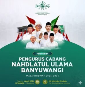 BANYUWANGI- Pean com. Pengurus Cabang Nahdlatul Ulama (PCNU) Kabupaten Banyuwangi masa khidmat 2026–2031 resmi dilantik pada Sabtu, 4 April 2026 di Ponpes Minhajut Thullab Desa Sumberberas, Muncar. Pelantikan yang dimulai sejak pukul 12.30 WIB ini akan menjadi momentum penting dalam melanjutkan estafet kepemimpinan organisasi keagamaan terbesar di daerah tersebut.